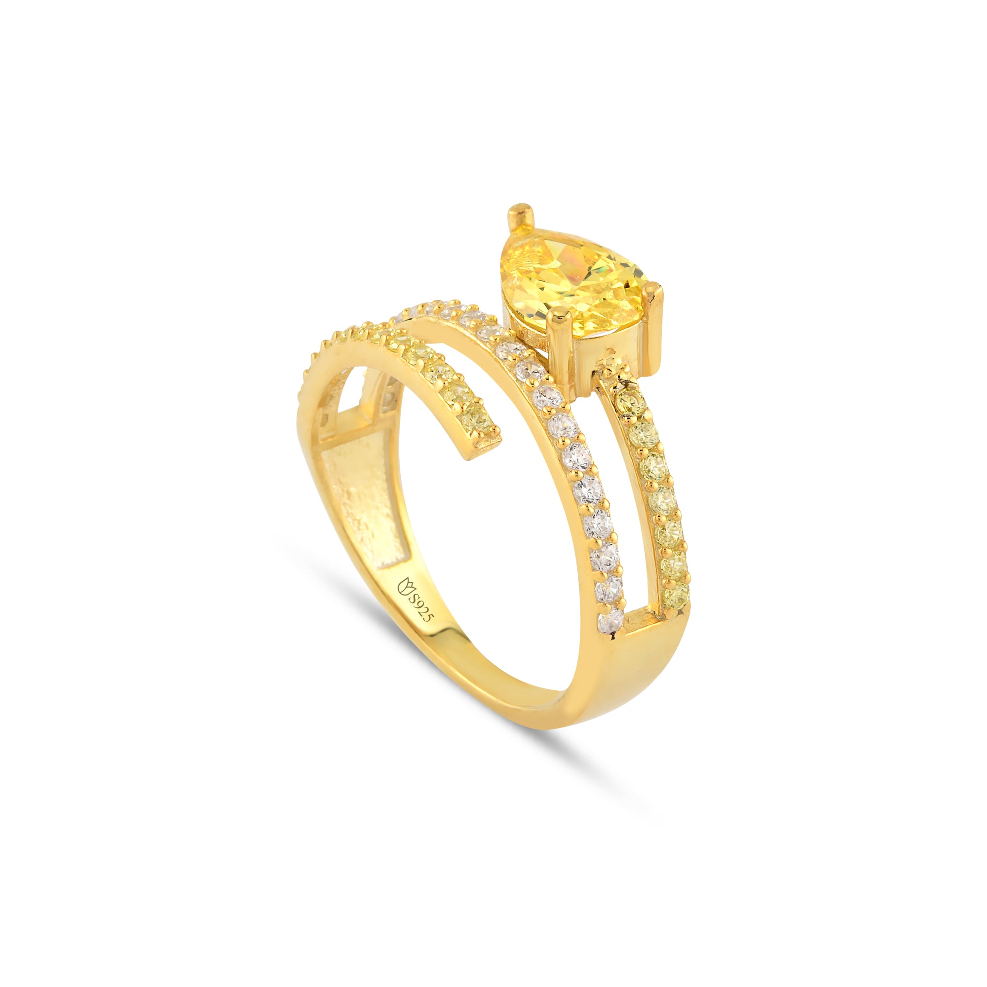 Sarı Zirconia Damla Taşlı Yüzük | 24 Ayar Altın Kaplamalı 925 Ayar Gümüş